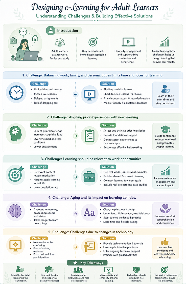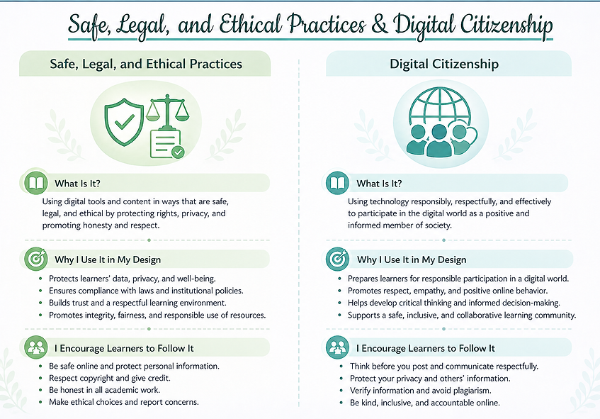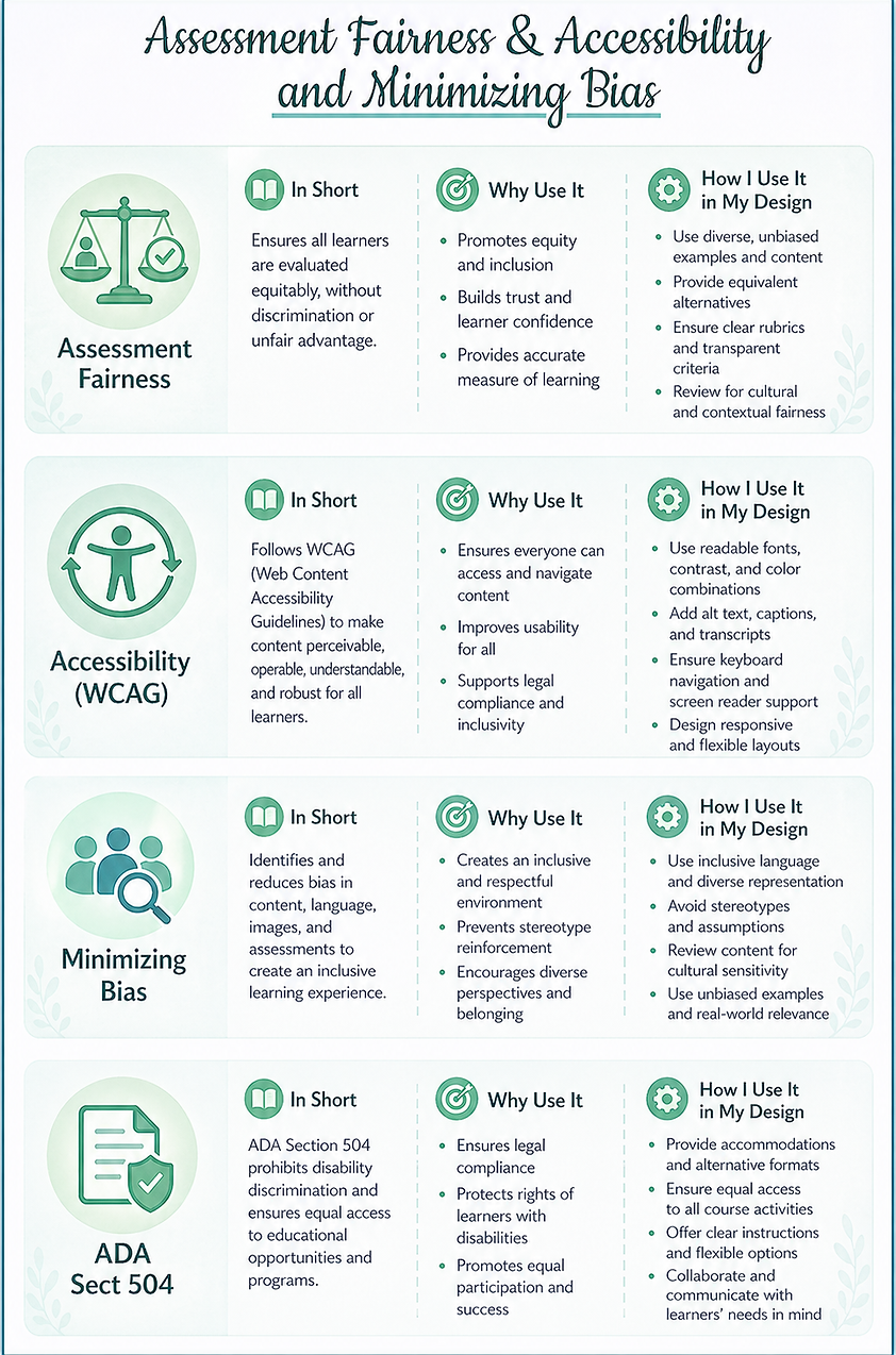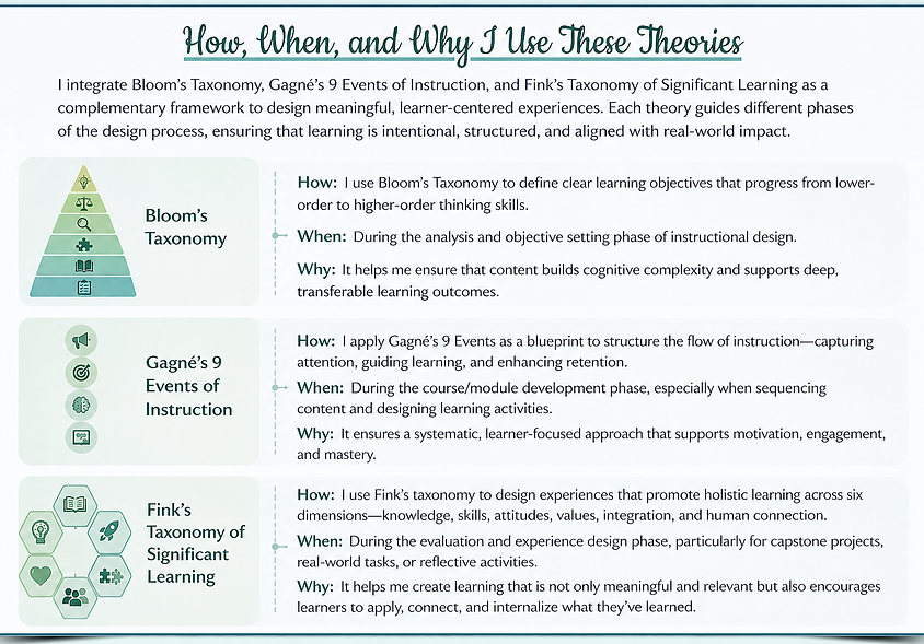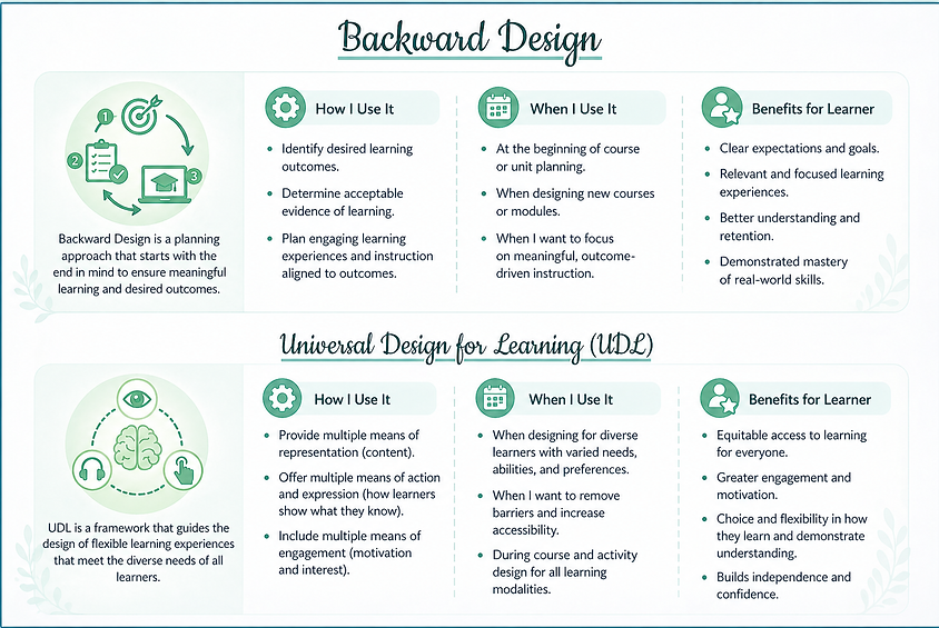 I apply frameworks like ADDIE, Backward Design, UDL, Bloom’s Taxonomy Andragogy and Pedagogy principles for structure learning.