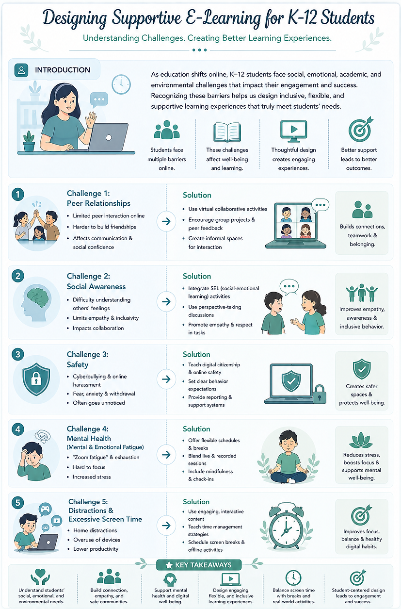 Example: Designed interactive learning modules using Canvas and Storyline 360. Created classroom materials with clear navigation, guided interactions, and accessible layouts to support diverse learners.